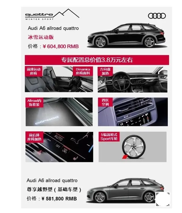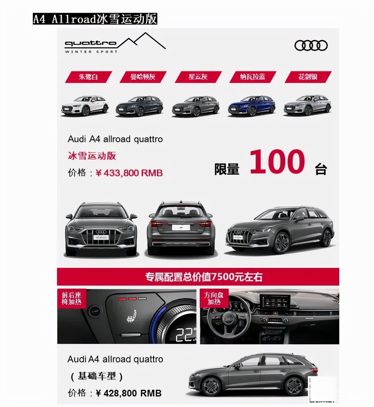 奥迪及时推出了奥迪A4 allroad冰雪运动版及奥迪A6 allroad冰雪运动版。其中奥迪A4 allroad冰雪运动版限量100台销售,售价43.38万元。奥迪A6 allroad冰雪运动版限量300台销售,售价60.48万元。