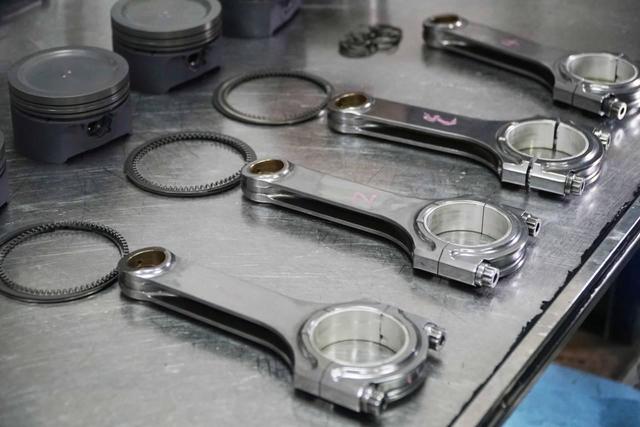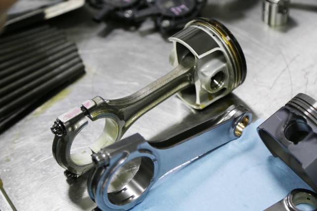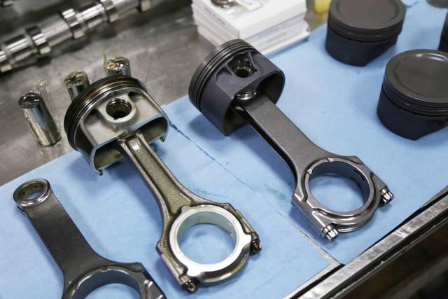 原厂活塞连杆(左)与更换的锻造活塞连杆(右)对比。
