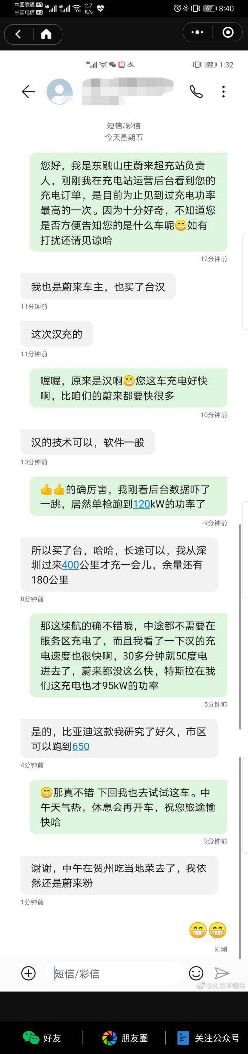 事情的经过是蔚来超充站负责人在后台看到充电“异常”,发现有一辆车的充电功率大大超过了往常,于是发信息向车主求证,结果发现是蔚来车主买的汉EV在充电,正是汉EV这次到访直接刷新了蔚来超充站的充电纪录。